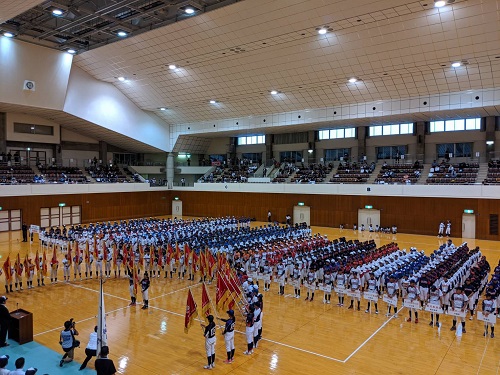 全国大会の開会式が行われました。あいにくの雨で体育館での開会式となりましたが、選手は元気に行進を行いました。 いよいよ、明日から試合が始まります。チームのテーマ“スマイル”を忘れずに、全力でプレーします。応援よろしくお願いします!